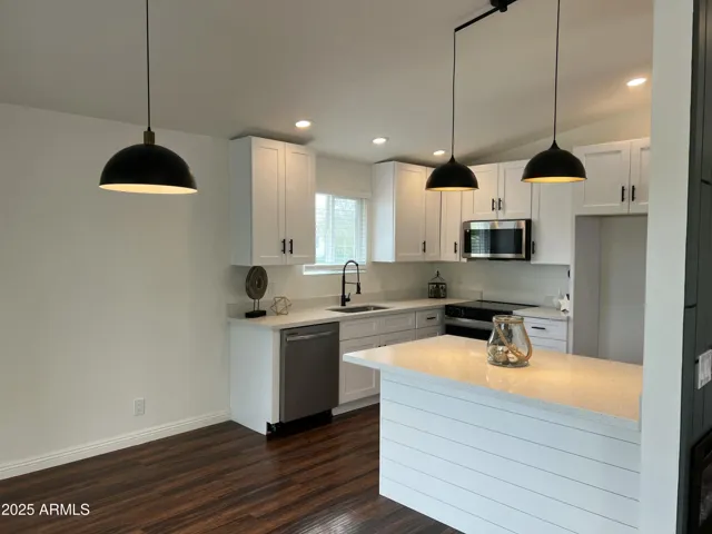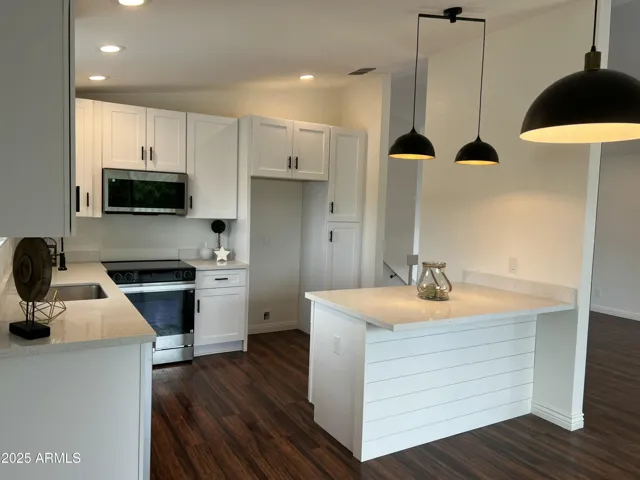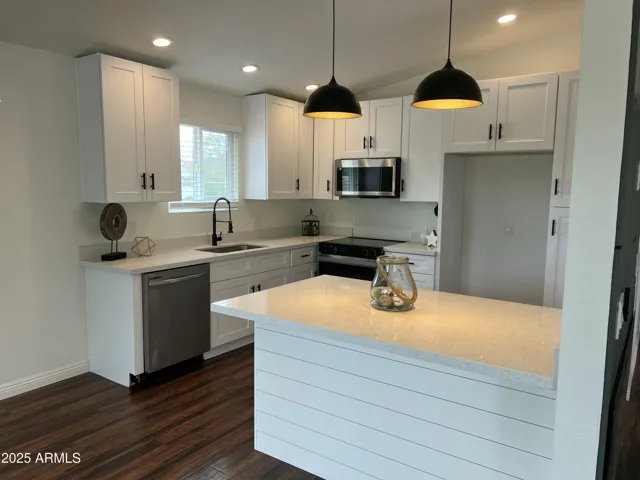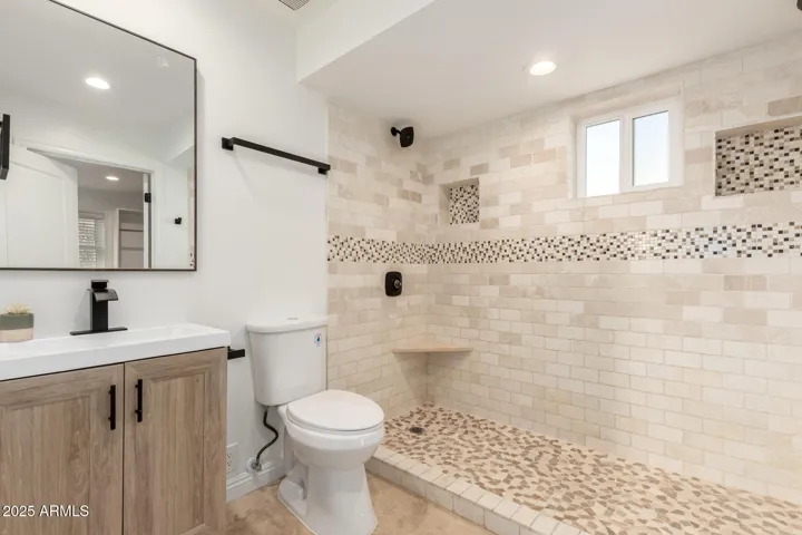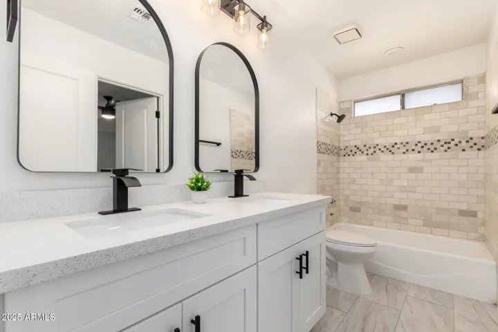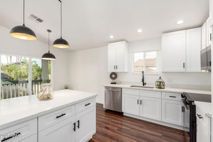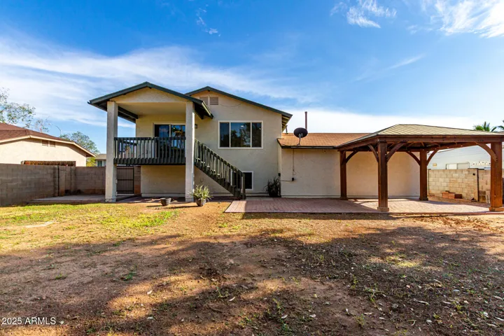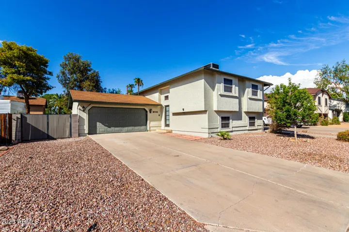 Walk into your ”hard to find” true 5 bedroom-2 bathroom home in quiet Mesa neighborhood. Tri-level home w/ recessed lighting, a contemporary palette w/ wood & travertine flooring & custom feature wall w/ electric fireplace. Upgraded kitchen w/with new quartz countertops, new white shaker cabinets, stainless steel appliances, a pantry &peninsula w/ breakfast bar. 2 large bedrooms upstair w/ primary bedroom suite downstairs offering a custom walk in closet and ensuite bathroom. 2 generously sized additional bedrooms downstairs. Step outside to your deck and enjoy cotton candy Arizona sunsets or dine outside under your large ramada. Home offers a 2 car garage and RV gate for all your toys or storage. Close to freeways, Dana Park shopping center, schools and more.