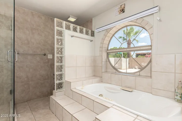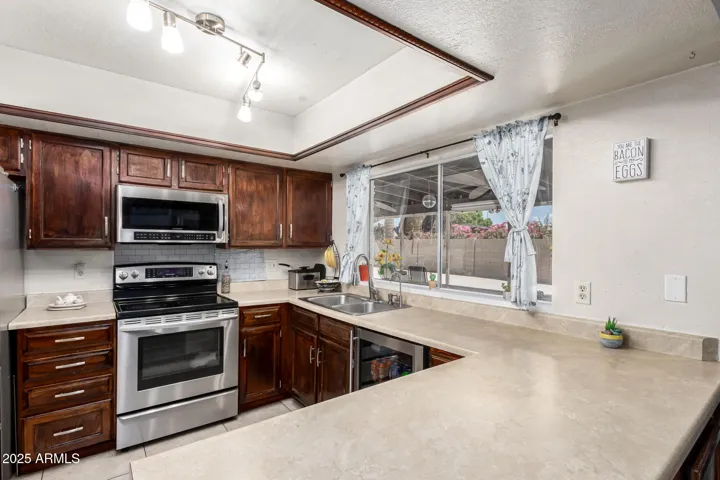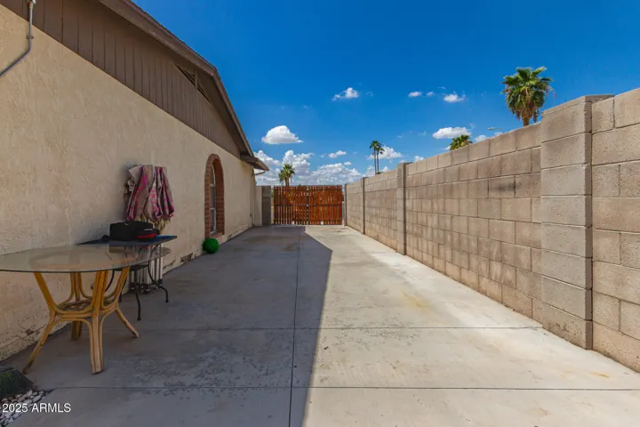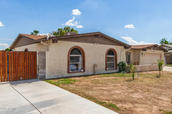 Spacious corner lot home with no HOA, RV gate, diving pool, and 2-car garage. Floorplan offers living and family rooms, formal dining, and eat-in kitchen. Kitchen includes stainless steel appliances, beverage cooler, wet bar, and plenty of cabinet space. Primary bedroom has backyard access, dual sinks, and jetted tub. Secondary bedrooms great size, guest bath with dual sinks and storage. Arizona room adds extra living space with dual fans. Backyard features oversized patio, concrete walkways, diving pool with slide, and landscaped borders. Updates include AC (2021), tankless water heater (2020), pool filter (2022), softener, and RO system. Convenient location near schools, shopping, and dining.