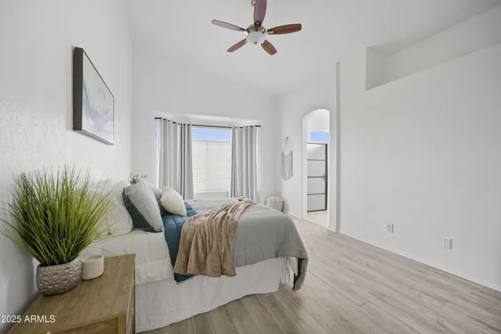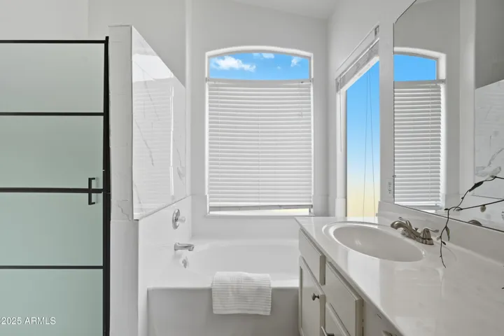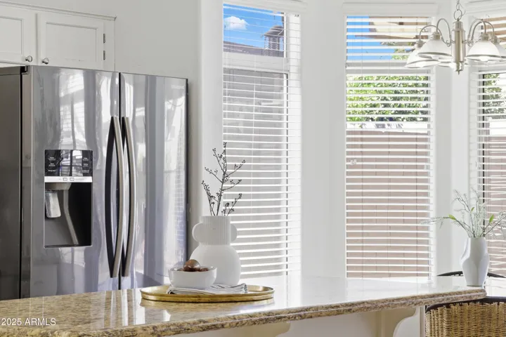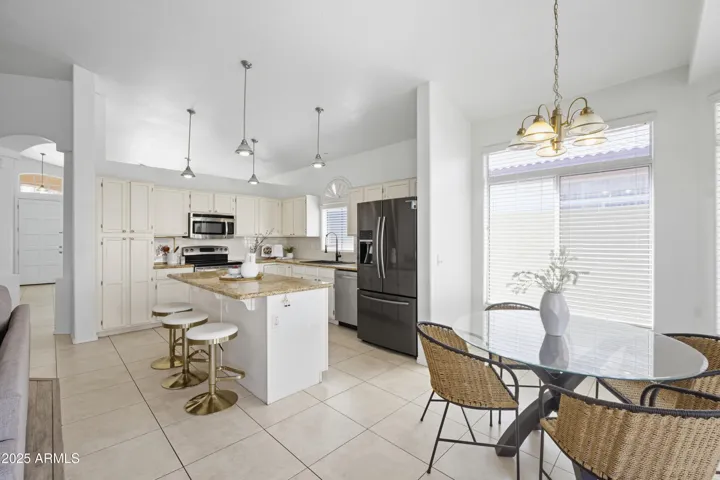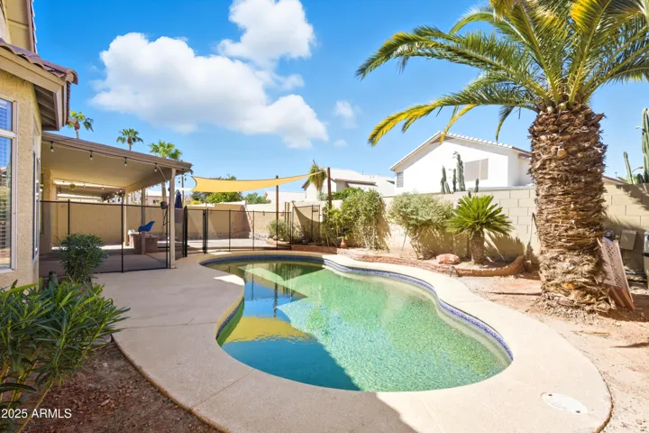 Step inside to an open, light-filled floor plan featuring vaulted ceilings, and a bright, inviting ambiance. The modern kitchen offers a subway tile backsplash, granite countertops, stainless steel appliances, and a large island that opens seamlessly to the family room—perfect for entertaining or relaxing with family. Enjoy serene backyard views from the main living areas, or retreat to the spacious primary suite with dual sinks, a soaking tub, and separate shower. With 4 bedrooms and 2 bathrooms, this home offers flexibility for any lifestyle. Step outside to your backyard oasis and cool off in the sparkling PebbleTec pool surrounded by lush landscaping and plenty of space to unwind. Located close to top-rated schools, shopping, dining, entertainment, and premier golf, this Palm Valley gem truly has it all. Don’t miss your chance to make this home yours!