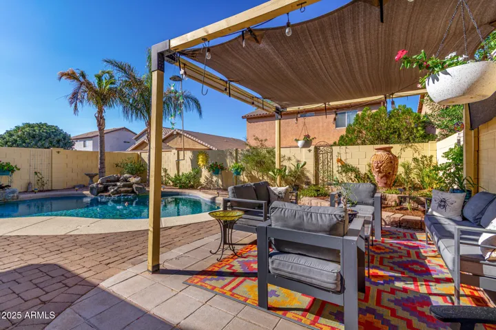 Beautifully maintained two-story home showcasing stunning brand new LVP flooring downstairs and a freshly painted interior. The open-concept kitchen features crisp white cabinetry, wainscoting, sleek black granite counters, a new backsplash, and stainless-steel and black appliances, creating a stylish and functional space. Upstairs you’ll find spacious bedrooms along with a versatile loft, perfect for a home office, gaming area, guest retreat, or whatever suits your lifestyle. Step through your newly installed slider doors to your backyard oasis with a sparkling pool accented by a natural rock formation, a new pergola, and a covered private patio ideal for relaxing or entertaining (right side wall added for extra privacy). Additional features include an A/C less than one year old, an oversized laundry room, a powder room downstairs, added insulation throughout the home, and new sunscreens on half the home providing added shade. And the Copper Basin community offers numerous amenities such a workout center with boxing and fitness classes, a pool, an activity room with ping pong, foosball, air hockey, and a library, weekly quilting club meetings, bingo, pickleball, basketball, soccer, tennis, common areas, biking and walking trails, and 13 playgrounds!