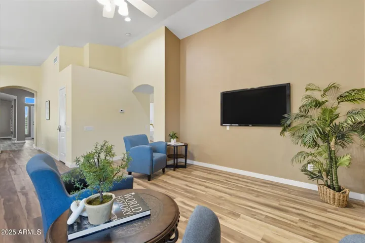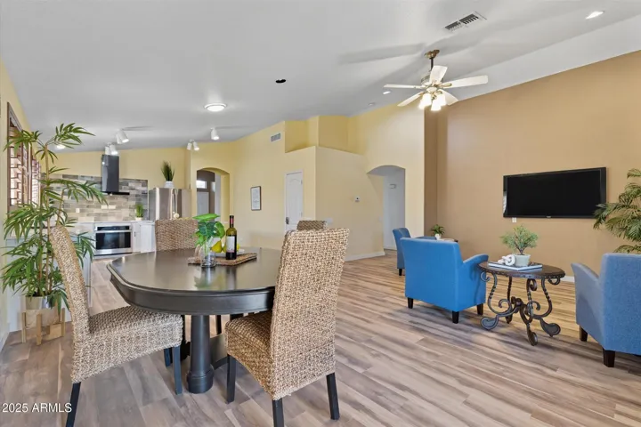 Updated 2,166 sq ft home in the gated community of Peralta Trail. Step inside to find wall-to-wall wood-look tile flooring, vaulted ceilings The updated kitchen is showcasing a large island with abundant storage and drawers, breakfast bar, pantry, granite countertops, stainless steel appliances, plantation shutters.Freshly painted outside. The spacious floorplan features 3 bedrooms, including one with a built-in murphy bed and storage unit that will stay. The primary suite has a garden tub, separate shower, double sink vanity, oversized walk-in closet, and private toilet room. Enjoy the convenience of an extended 2-car garage with built-in cabinets and plenty of room for a pickup truck. The low-maintenance backyard is designed for year-round enjoyment with a covered patio, artificial turf, and a sparkling pool.