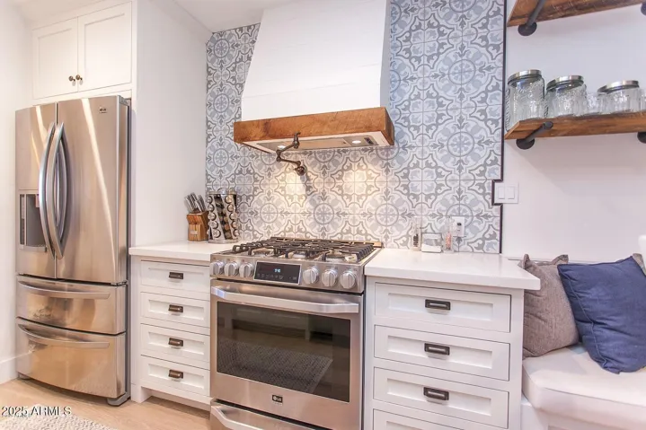 The interior features thoughtful design details including barn doors, a fireplace, a dedicated office area, custom cabinetry, and a spacious utility room with rustic brick flooring and modern industrial accents. The kitchen is a standout, equipped with an LG gas stove and designed for those who love to cook. Outdoors, the property offers multiple spaces to enjoy and entertain — a private pool, outdoor shower, fenced front yard, pet yard, and a covered patio. This home is move-in ready and combines charm, functionality, and location.