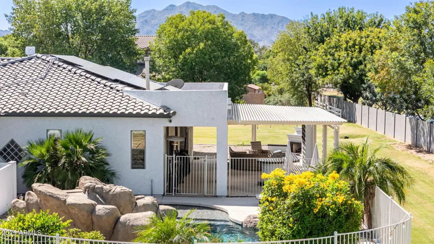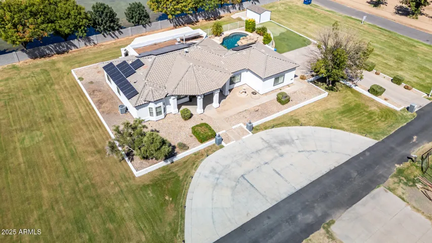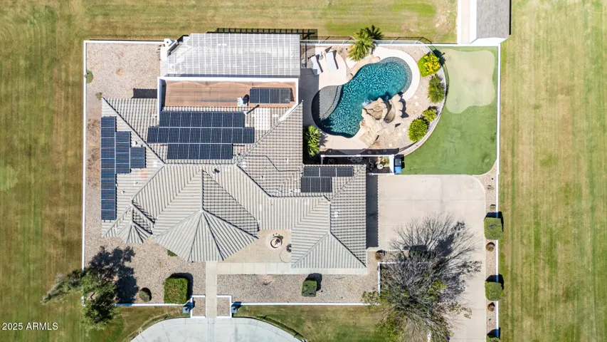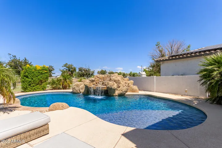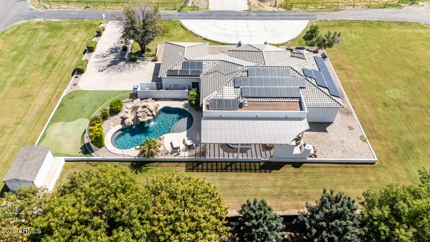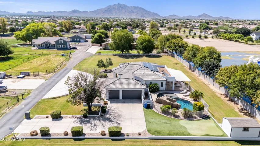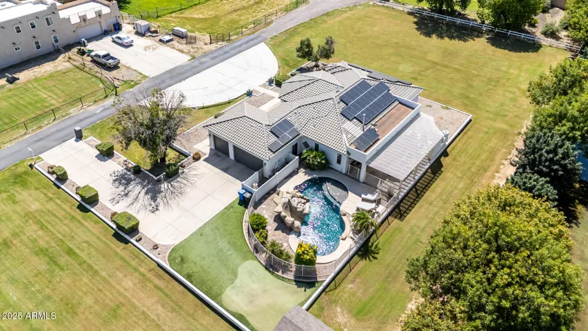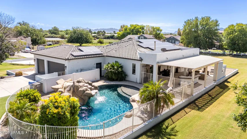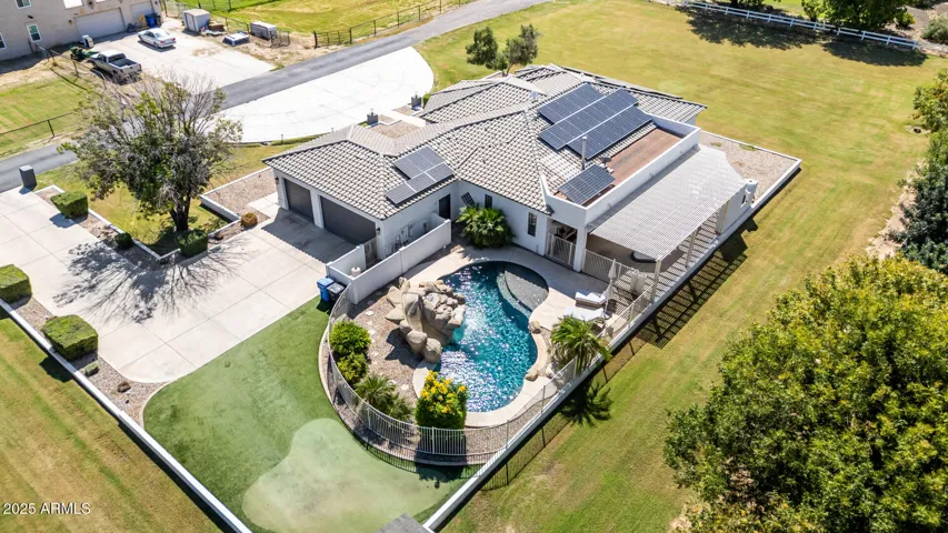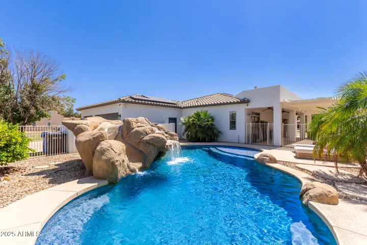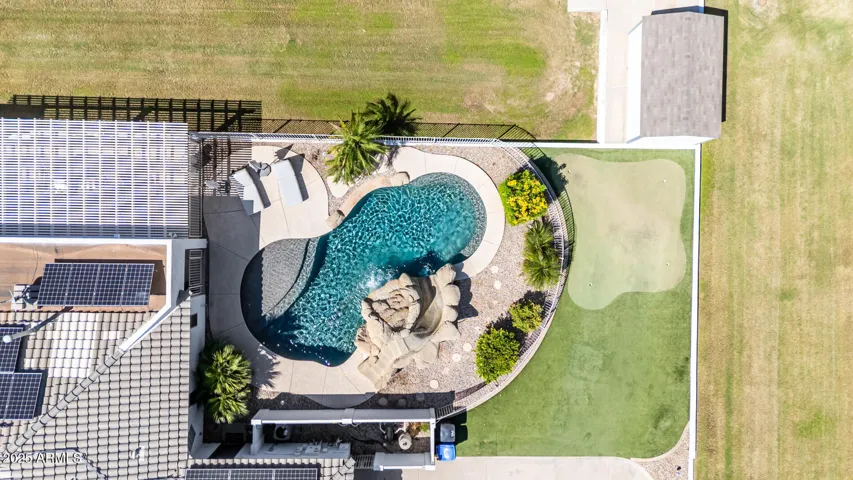 Own a rare slice of paradise with over an acre of land—perfect for family living, pets, and recreational toys. This luxurious property boasts a resort-style backyard with a custom pool featuring a waterslide, waterfall, and grotto, plus a private putting green and expansive covered patio. Inside, enjoy 3 spacious bedrooms, a versatile den/office (easily a 4th bedroom), and 3 modern bathrooms, including a newly renovated master bathroom. Enhanced with cost-saving solar power and economical irrigation, this private oasis keeps your grounds lush while saving thousands annually. Energy-efficient spray foam insulation in the attic ensures year-round comfort. Embrace luxury, space, and savings in your forever home! No HOA!