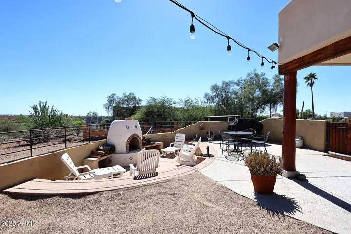 Step outside and enjoy beautifully designed desert landscaping, a fenced, raised-bed garden, and an expansive covered patio. Gather with friends and family around the charming kiva fireplace, where cozy evenings are enhanced by the panoramic mountain views in the distance the perfect blend of comfort and desert serenity.