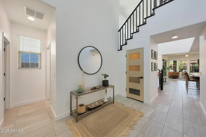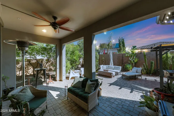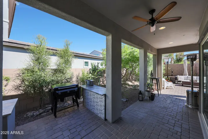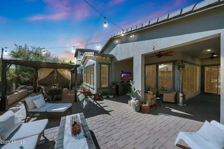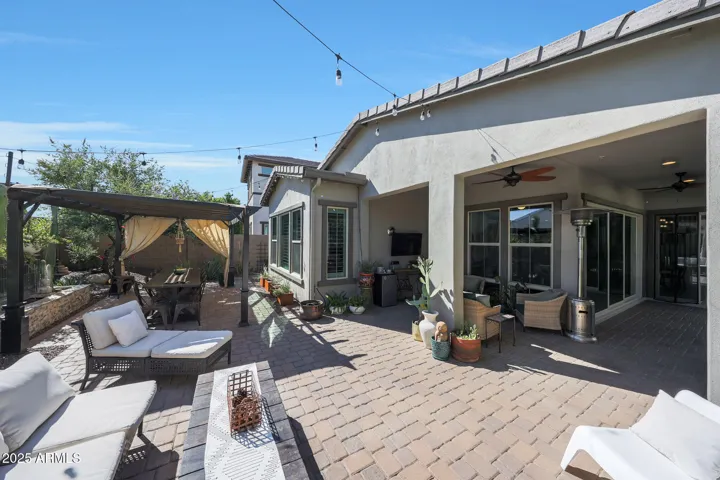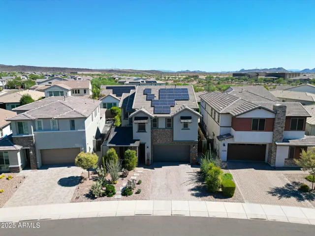 Elevated BEYOND NEW with designer finishes and upgrades throughout the entire property! This beautiful and modern 5 BEDROOM, 4 FULL BATHROOM home sits on a private cul-de-sac lot and showcases extensive upgrades including new ACs, fresh paint, tile and laminate plank flooring and shutters throughout. Light pours through expansive and huge sliders, connecting the great room to a lush backyard retreat featuring pavers, a gorgeous water feature, dining pergola, and outdoor shower. The gorgeous chef’s kitchen impresses with matte black cabinetry, beautiful white quartz counters, gold hardware, newer white glass & stainless appliances, a custom tile backsplash, a farmhouse sink, walk-in pantry, and a custom butler’s pantry. Downstairs you’ll find the private primary suite & an additional guest bedroom and a full bath. Upstairs offers a large loft/2nd family room, 3 bedrooms, and 2 full baths. OWNED OUTRIGHT solar ensures low energy costs, and the 3-car tandem garage boasts epoxy floors, sink, storage, and EV charger. No neighbors across the street allows plenty of parking for guests. Close to Vistancia Elementary, American Leadership Academy, shopping, dining, the 303 freeway, and the new Tech Corridor, including the TSMC plant.
