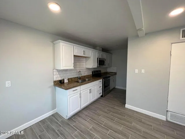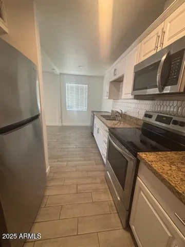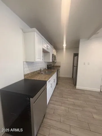 This beautifully updated duplex offers a bright and inviting living space with modern finishes throughout. Freshly painted and move-in ready, this home is perfect for anyone seeking comfort and convenience. 1 spacious bedroom and 1 full bathroom with tile shower with frameless shower door. Fresh new paint throughout for a clean – modern look with stylish gray vinyl plank flooring throughout, stainless steel appliances in the kitchen, and new blinds. Nice covered back patio with a private backyard, and a covered carport for convenient parking. Centrally located with easy access to Loop 202, SR-51, and I-10 freeways. This duplex is clean, bright, and ready for you!