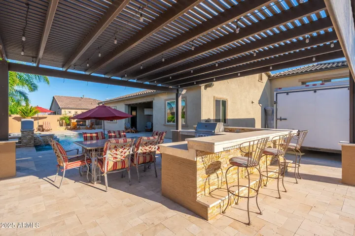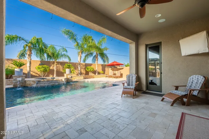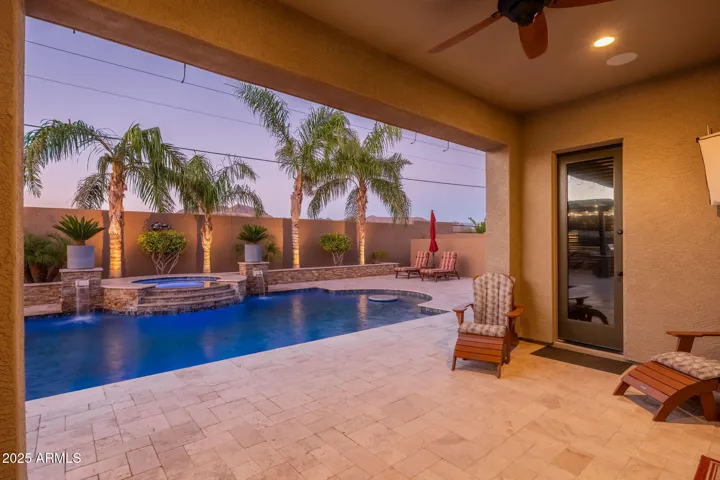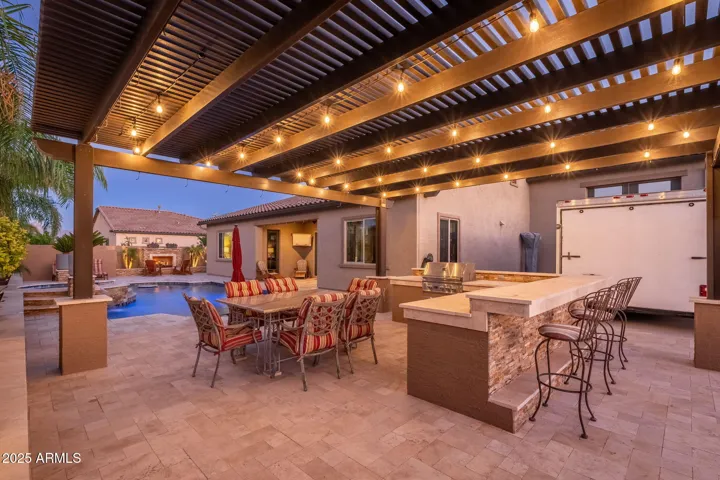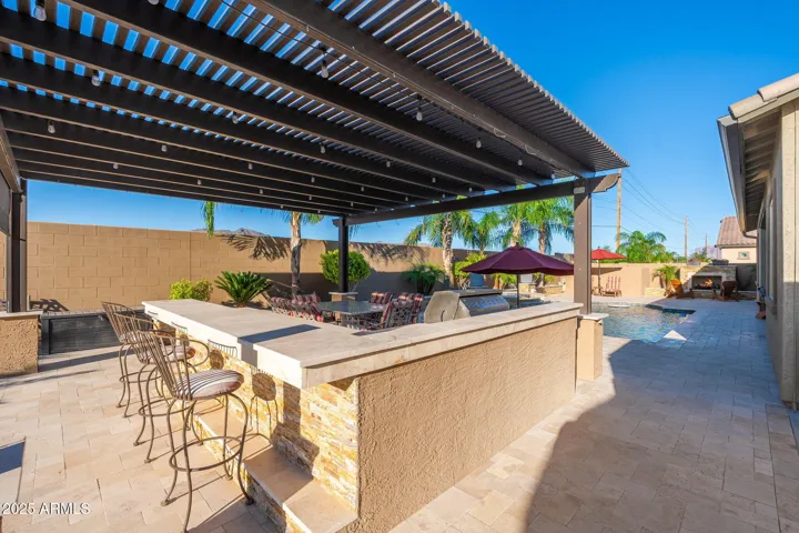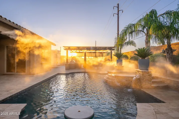 Inside, the home showcases granite countertops, upgraded stainless steel appliances, custom cabinetry, two-tone paint, upgraded tile and carpet flooring, custom window treatments, 12 foot ceiling, and designer fixtures throughout. An open layout connects seamlessly to the outdoor living areas. The backyard is a true retreat featuring a Pentair heated pool and spa with dual gas/heat pump IntelliLogic controls, variable speed pumps, misting system, outdoor pergola, extensive travertine deck, exterior gas fireplace, built-in BBQ, and outdoor and holiday lighting. Thoughtful landscaping and block fencing frame the oasis perfectly.