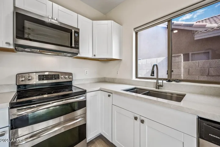 *Brand-new kitchen with white shaker cabinets, quartz countertops, stainless steel appliances, and pantry