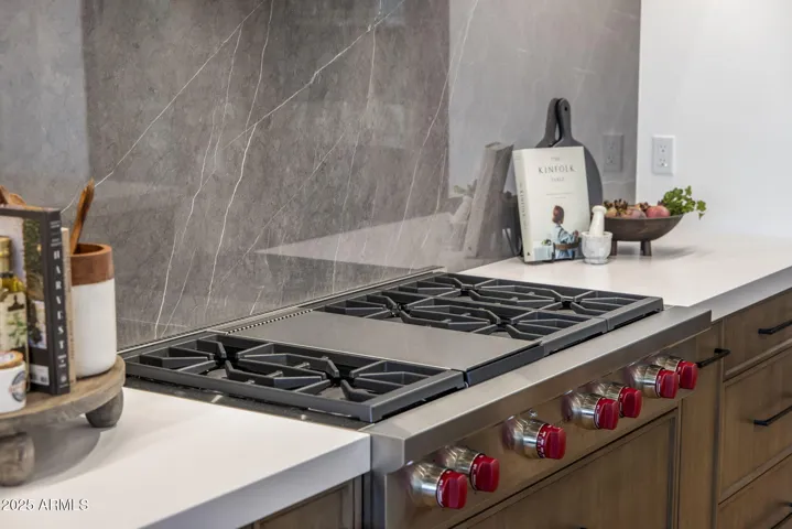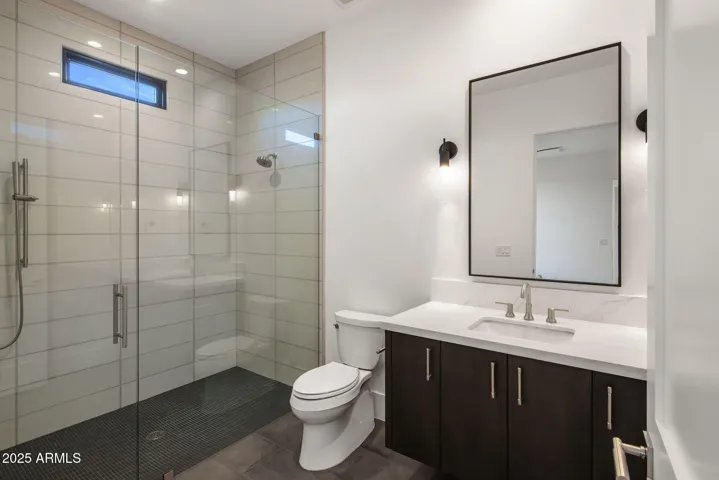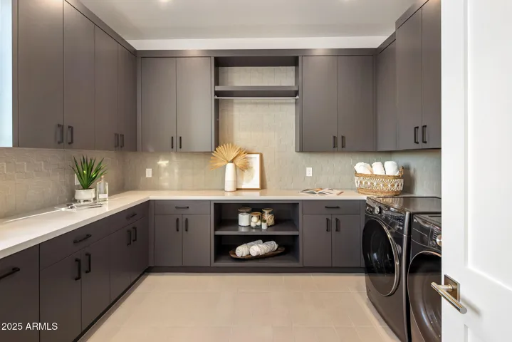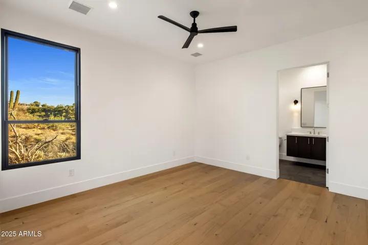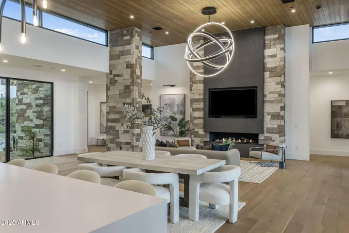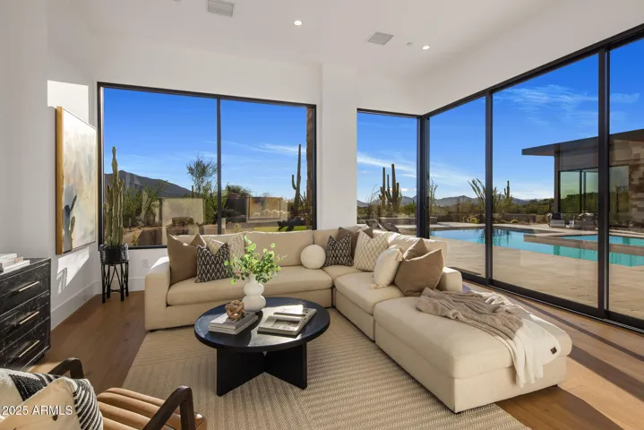 Outdoor living is reimagined with covered patios, a sparkling heated pool and spa, a gas fireplace and fire pit, and an outdoor barbeque perfect for evenings under the Arizona sky. Floor-to-ceiling glass blurs the line between indoors and out, inviting natural light and panoramic views into every space.
