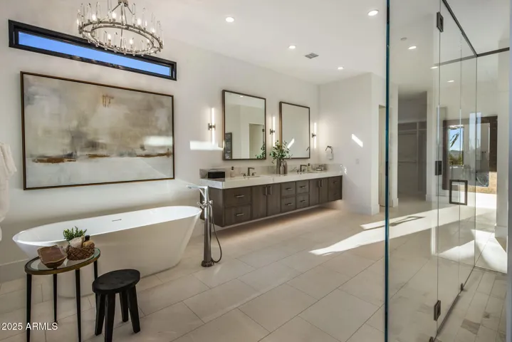 From the moment you arrive, every detail reflects world-class craftsmanship and design. The great room’s soaring 15′ ceiling and statement fireplace set the stage for gatherings, while the chef’s kitchen impresses with a waterfall-edge island, custom cabinetry, Wolf and Sub Zero appliances, premium countertops, and designer lighting. An adjacent bar with glass windows opening to the outdoors makes seamless entertaining effortless, complemented by a butler’s pantry, mudroom, and expansive laundry suite. The primary retreat is a sanctuary with dual walk-in closets, a spa-inspired bath featuring a soaking tub under a chandelier, dual vanities, and a luxurious walk-in shower. Two additional bedrooms each with their own bathrooms offer privacy and comfort, while a flexible fourth bedroom/office/flex room adapts to your lifestyle needs.