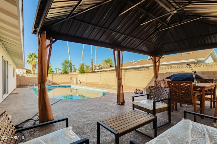 Beautifully updated single-story home featuring 4 bed/2 bath, ideally situated in Phoenix. This well-maintained property offers convenient access to premier shopping, dining, and major freeways. Inside, you’ll find new tile flooring throughout the living room and kitchen, complementing the modern and functional layout. The kitchen has been thoughtfully updated with granite countertops, dark wood cabinetry, and stainless steel appliances. A spacious laundry room provides ample storage, while the generous 2-car garage adds additional convenience. Step outside to a private backyard oasis complete with a sparkling diving pool, pergola, and plenty of space for outdoor enjoyment. Security screens on all windows. No HOA! You won’t want to miss out on this home!