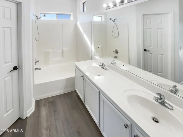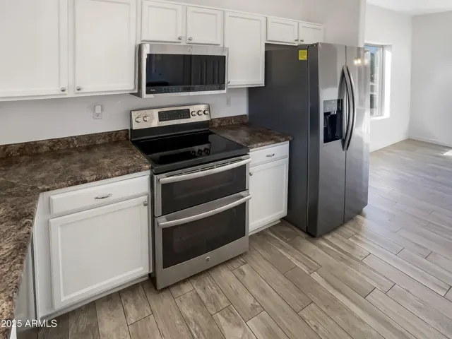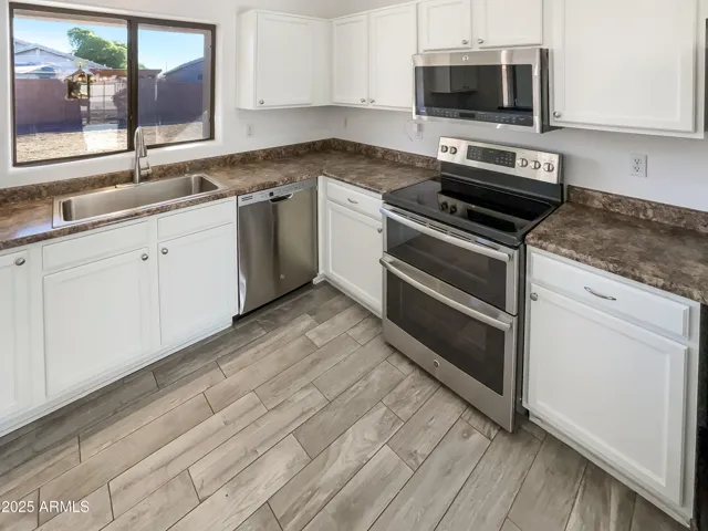 Welcome to this beautiful home which includes a deck off the primary bedroom in Goodyear. The home boasts a neutral color paint scheme and fresh interior paint, creating a serene and inviting atmosphere. The kitchen is equipped with all stainless steel appliances . The primary bedroom offers a spacious walk-in closet, while the primary bathroom is designed with double sinks for added convenience. The exterior of the home is just as impressive with low maintenance landscaping, a covered patio, and a fenced-in backyard.This property is a must-see for those seeking a comfortable and stylish living environment.. Included 100-Day Home Warranty with buyer activation