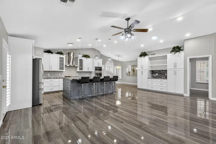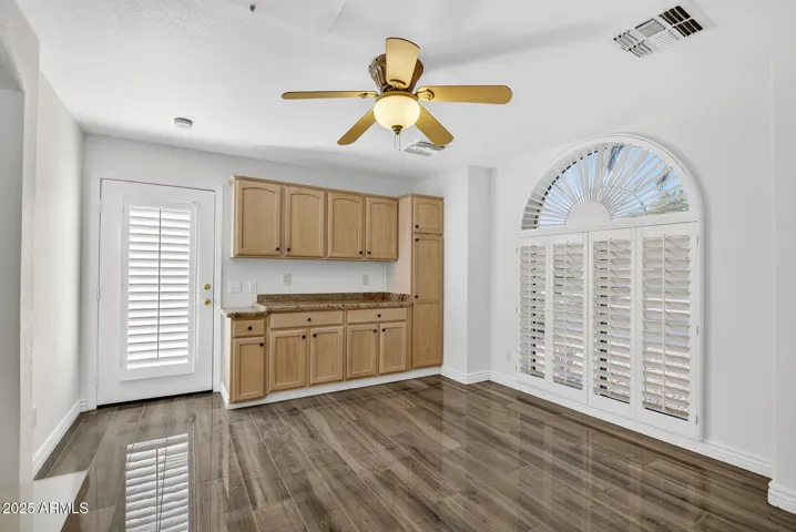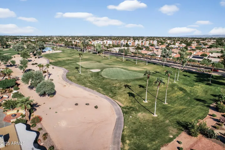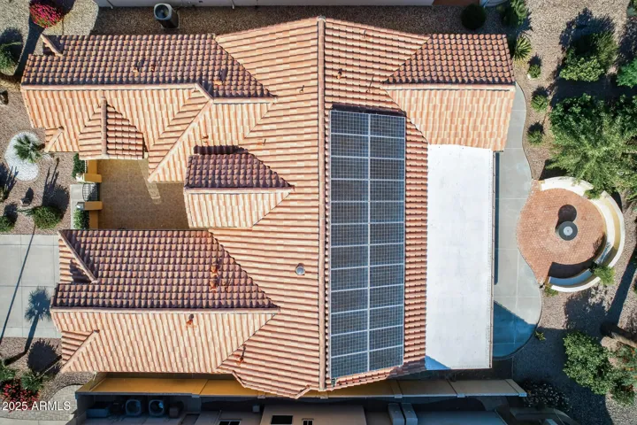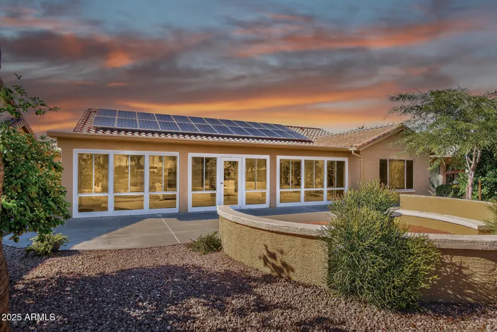 Experience resort-style living in this stunning PebbleCreek home, perfectly situated on the Tuscany East Golf Course. The main residence offers 3 spacious bedrooms and 2 baths, complemented by a private casita with a full bath—ideal for guests or a quiet retreat. Inside, an open great room floor plan with vaulted ceilings, plantation shutters, and porcelain tile flooring throughout creates an elegant, airy feel. The gourmet kitchen features granite countertops, high-end appliances, and plenty of storage. A welcoming front courtyard seamlessly connects the main house and casita, while the enclosed lanai with tile flooring provides a serene space to enjoy golf course views. Additional highlights include owned solar panels, an extended-length garage, and timeless finishes throughout!