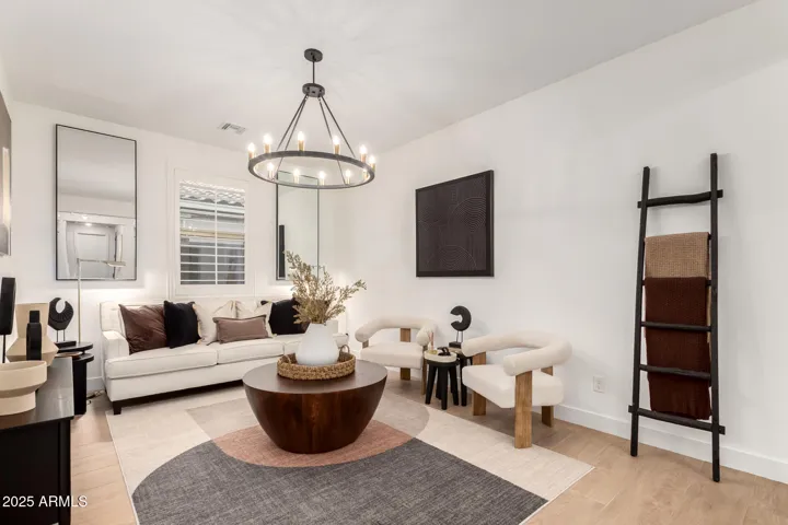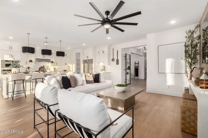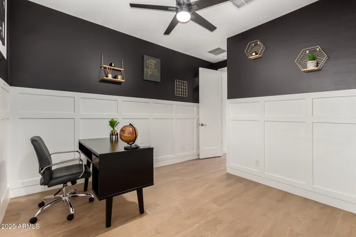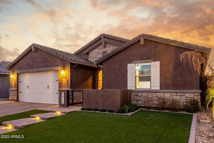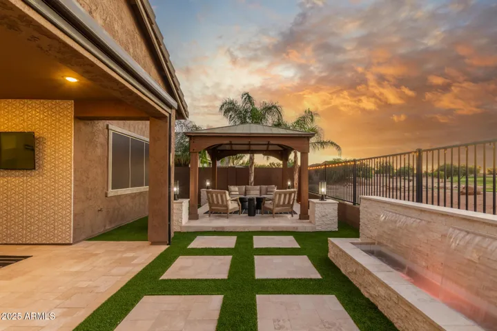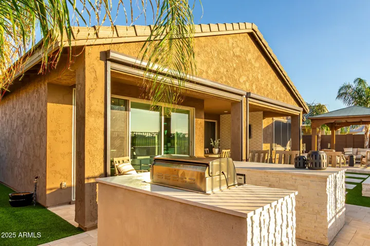 Welcome to an extraordinary home situated on a breathtaking golf course lot in the sought-after Palm Valley gated community. This stunning residence is designed to impress, featuring elegant white shaker cabinetry that reaches from floor to ceiling and paired with top-of-the-line kitchen aid stainless steel appliances and a gas range. The thoughtfully designed kitchen includes a separate microwave and oven, luxurious quartz countertops, and a subway tile backsplash. As you step inside, you’ll be captivated by the array of exquisite upgrades, including beautiful tile plank flooring throughout the main living areas and cozy Berber carpet in the bedrooms. The master suite is a true sanctuary with a separate tub and tile designed shower along with dual vanities for added convenience and style. Every detail has been carefully curated, from custom shutters and upgraded mirrors and stylish fixtures throughout and wainscoting wood work and acoustic deco wall . Custom exterior electric remote sun shades on back exterior . A soft water system and well-organized garage cabinets with epoxy flooring. The elegant curb appeal and paver driveway to enhance the home’s curb appeal, making a lasting impression. Step into the backyard paradise, designed for ultimate relaxation and entertaining. Here, you’ll find a stunning travertine patio, a custom water feature, tile decorative wall and a beautiful pergola that creates the perfect spot for unwinding. The dual barbecue area, featuring cultured stone and a grill and refrigerator, sets the stage for delightful outdoor gatherings, with ample bench seating and lush turf throughout the space. Golf course views but no golf balls in your yard. With awe-inspiring views and located in a gated community that offers a refreshing community pool and inviting common areas with Ramadas, this home exemplifies pride of ownership and meticulous maintenance. Don’t miss the opportunity to embrace the exceptional lifestyle that this magnificent property provides! The sunset views are spectacular!