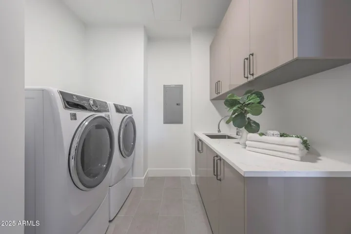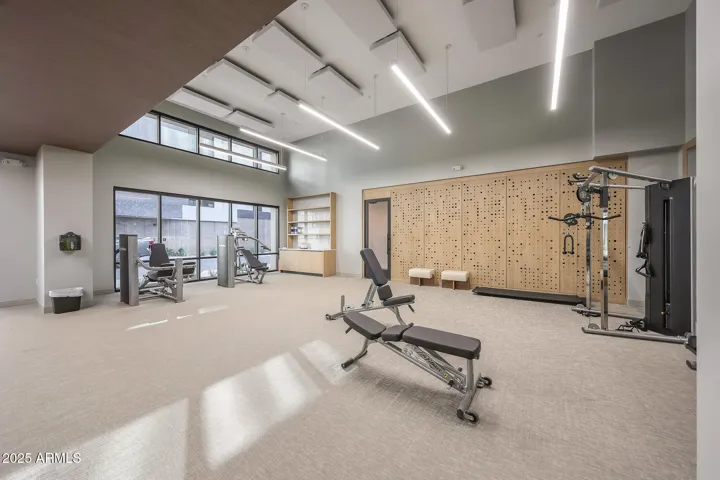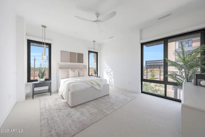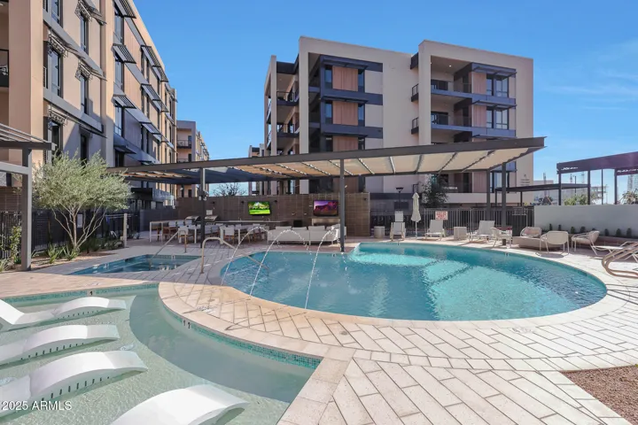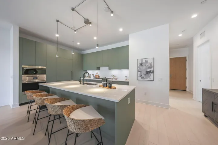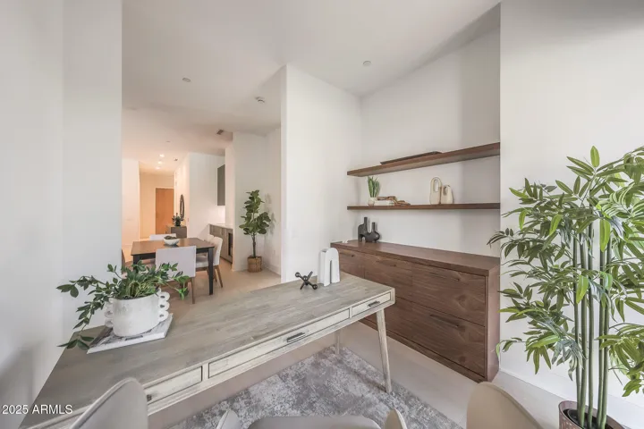 Welcome to luxury living at Portico, the exclusive 112-unit enclave nestled 2 minutes from your favorite North Scottsdale restaurants (plus Whole Foods) and 5 minutes from Grayhawk Golf Club & the TPC of Scottsdale. With 2 bedrooms, a den and 2.5 baths, your highly upgraded home features light wood floors and a chef’s kitchen with sage green Italian cabinetry, integrated Sub-Zero/Wolf/Miele appliances and under-cabinet lighting. Elegant quartzite countertops throughout. Your great-room features a custom walnut media center (with TV) and a wall of telescoping sliding doors opening to your spacious terrace. Your primary suite offers motorized window shades (entire home), a bespoke walk-in closet and an oversized walk-in shower. Entertain in the clubhouse, poolside or at the BBQ pavilion. The clubhouse also features a state-of-the-art workout room and a complete kitchen and living room, giving you even more options for enjoying the Portico lifestyle–and sharing it with friends and family. And for your four-legged family members, there is a designated Doggy Splash Zone with water jets and fenced play space. Ground-level secure, designated parking completes your lock-and-leave Portico lifestyle.