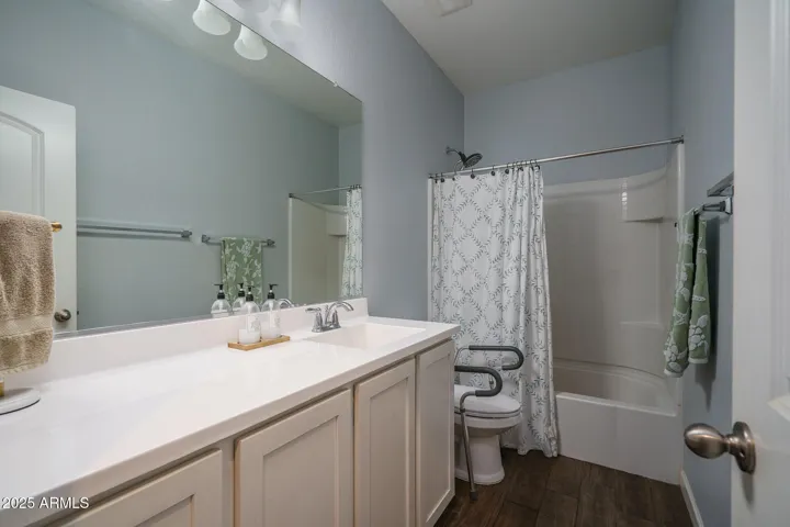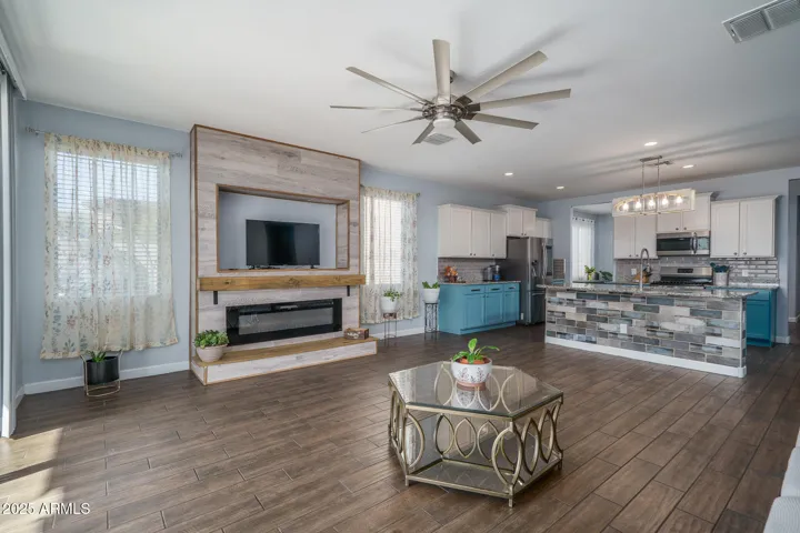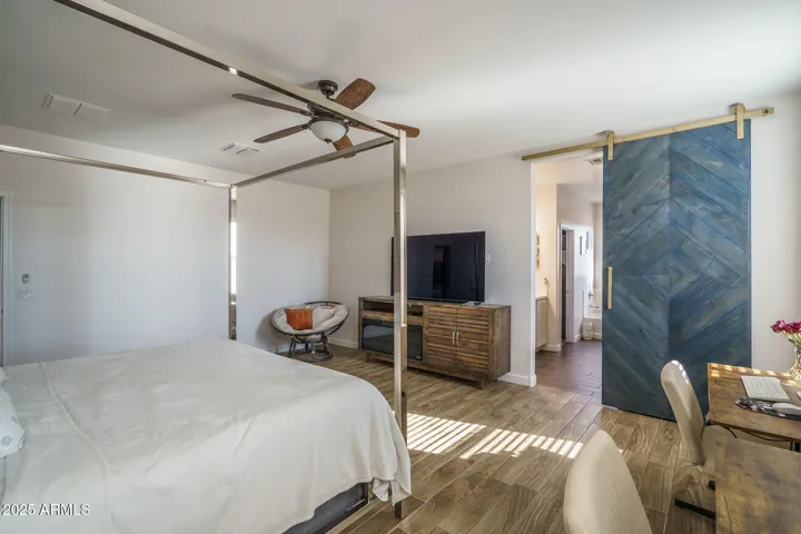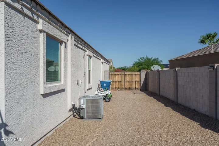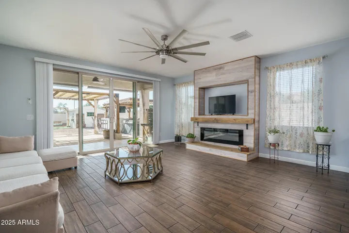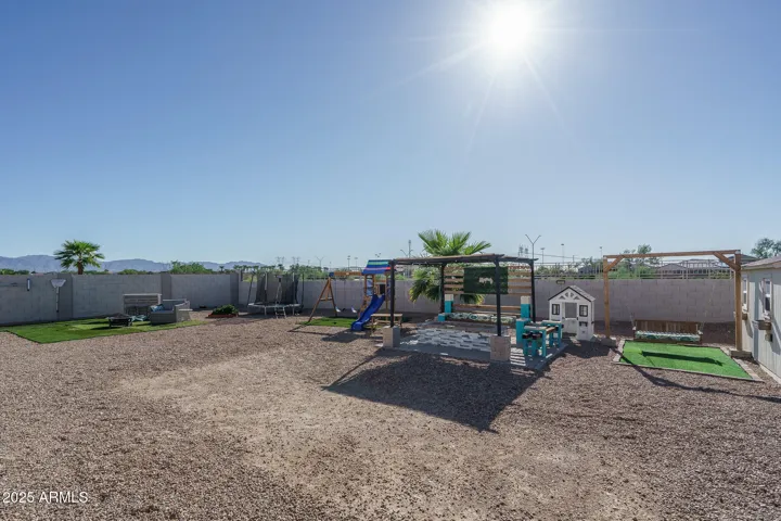 Welcome to this spacious, original-owner gem located on an oversized homesite backing a serene desert wash, offering 4 bedrooms and 3 baths within 2,684 sq ft of well-designed living space. The open floor plan boasts a great room with an inviting electric fireplace, a formal dining area, & a charming den framed by stylish barn doors. The gourmet kitchen dazzles with two-tone cabinetry, granite countertops, subway tile backsplash, stainless steel appliances, a walk-in pantry, and a center island with breakfast bar and pendant lighting-perfect for entertaining. Expansive multi-panel sliding doors seamlessly connect to a pergola-covered patio & a generous backyard featuring an outdoor kitchen, above-ground spa, a fully wired ”she-shed,” low-maintenance landscaping, stunning mountain views, and complete privacy with no backyard neighbors. The oversized primary suite impresses with a custom barn door entry, dual sink vanity, separate tub and shower, and an expansive walk-in closet, while a secondary bedroom offers its own private en-suite bathideal for guests. Additional highlights include elegant stone exterior elevation, an RV gate, a 2-car garage with epoxy flooring, and leased solar panels that provide valuable utility savings. All this just a short stroll from the vibrant Tartesso Sports Park, combining comfort, style, and location in one irresistible package.