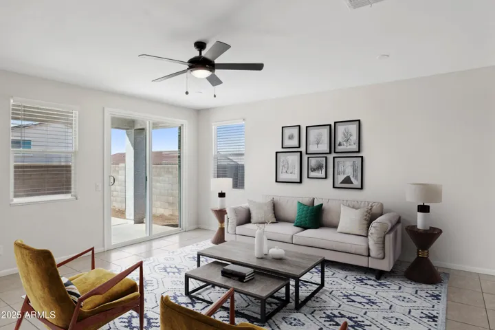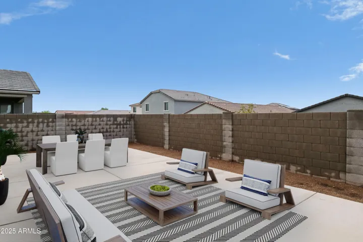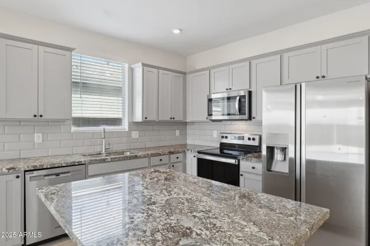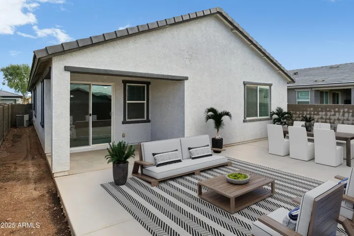 Large and low maintenance backyard. Built in 2021, this 3-bed, 2-bath single-story home offers 1,706 sq ft of modern living. Features an open-concept floor plan, granite kitchen countertops with large island, split bedrooms, energy-efficient windows, and a primary suite with walk-in closet and dual sinks. 3-car tandem garage. Enjoy a well-kept front yard and backyard with covered patio. Enjoy resort-style amenities right outside your door: two state-of-the-art parks, pools, splash pads, playgrounds, sports courts, dog park, picnic areas & trails. Convenience is unmatched with premier shopping and dining just minutes away (Prasada, Surprise Marketplace, Target, Fry’s Marketplace & more), with many nearby school options, plus easy freeway access to 303 and US60, and 20 minutes to I-10.