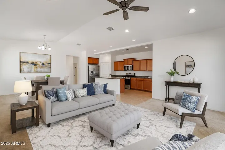 Popular Dakota plan with a tandem 3-car garage! Offering 1,594 sq. ft. with an open floor plan. 3 bedrooms, 2 full baths. Fresh paint, light and bright. 8′ interior doors, and vaulted ceiling in the great room. Paver driveway. Energy efficient. Centrally located to Hwy 89 and 89A just minutes from the downtown Prescott Square and the Airport. Fantastic starter, or second home!