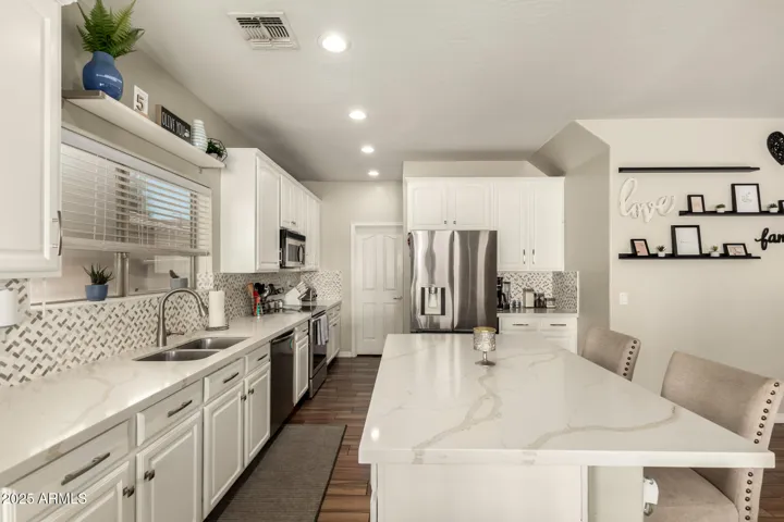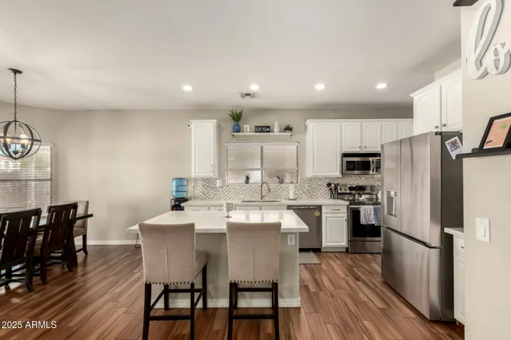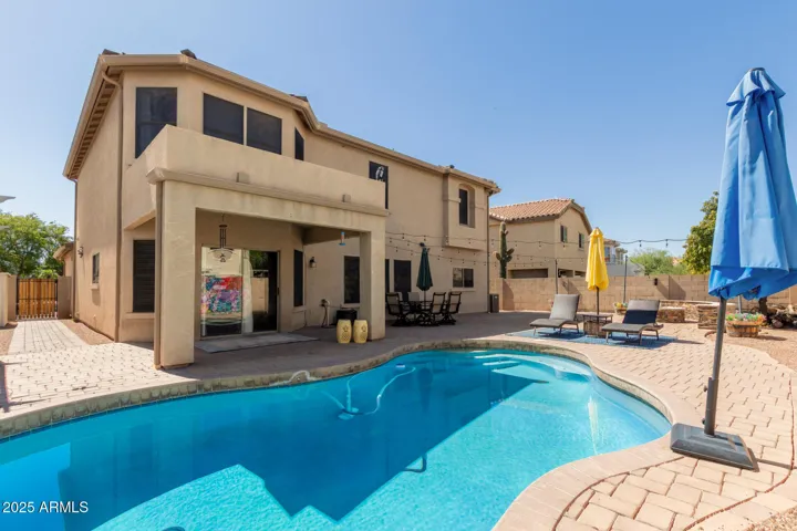 Experience comfort and convenience in this thoughtfully designed 5-bedroom home! Discover an inviting living & dining room and a large great room, filled with lots of natural light, ideal for both entertaining and relaxation. Impeccable kitchen offers recessed lighting, tile backsplash, a walk-in pantry, quartz counters, a center island with a breakfast bar, ample cabinetry, stainless steel appliances, and a cozy breakfast nook with a lovely bay window. Large primary bedroom is upstairs for extra privacy, boasting a sitting area, a walk-in closet, and a private ensuite with dual sinks. Make the flexible den an office, study, or media space. Be amazed by the wonderful backyard complete with a covered patio, fire pit, and a swimming pool. Don’t let this gem slip by. Hurry!