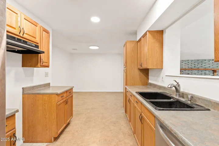 Inside, the home centers around a functional kitchen with abundant cabinet space and a convenient passthrough window that makes entertaining effortless.