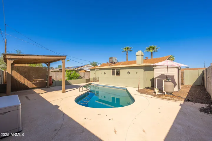 The spacious backyard is designed for Arizona living, offering a covered patio and sparkling pool—perfect for gatherings or simply relaxing in the sun.