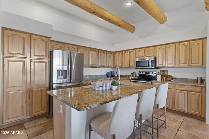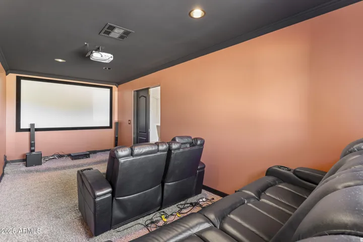 Inside, the home blends warmth and sophistication. The family room features beam-accented ceilings and a custom fireplace, while the kitchen showcases hickory cabinetry, granite counters, and an open flow ideal for entertaining. A dedicated theater room is included, creating a perfect space for movie nights or gatherings. The primary suite offers private backyard access, a walk-in closet, and spa-like comfort. A generous laundry room with built-in storage and sink adds convenience.