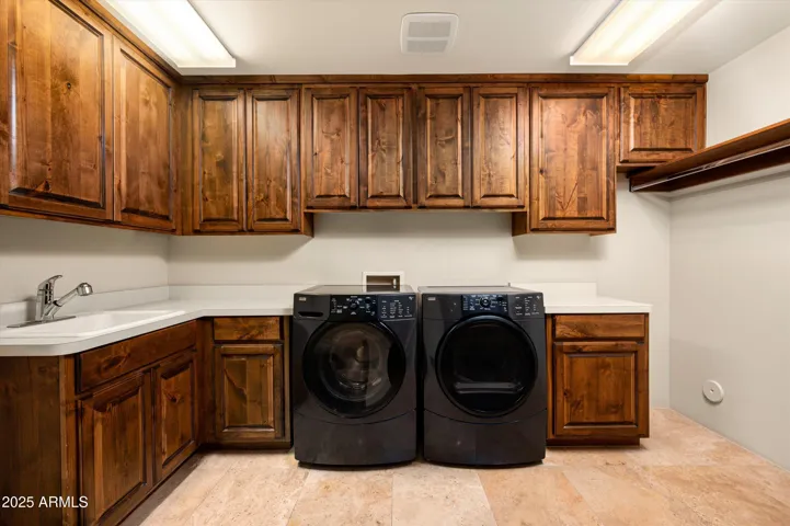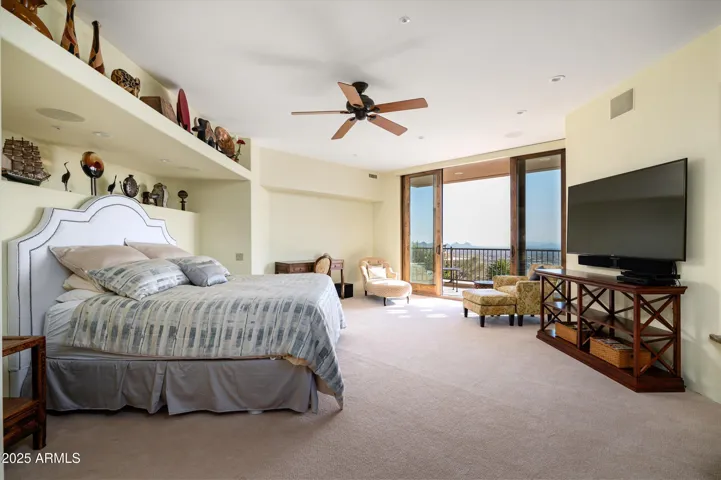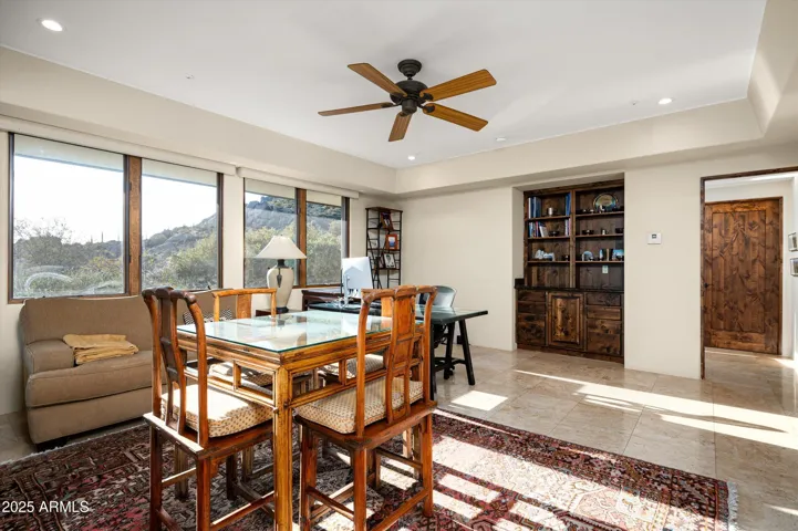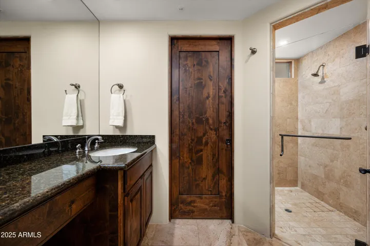 The private casita overlooks the pool/views and includes a full bedroom suite along with an office or den—ideal for guests or remote work. The lower level includes additional bedrooms and flexible spaces such as a theater and exercise room, offering privacy and comfort for family and visitors alike. An oversized three-car garage is complemented by a convenient elevator leading directly to the main living area.