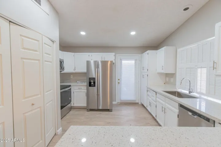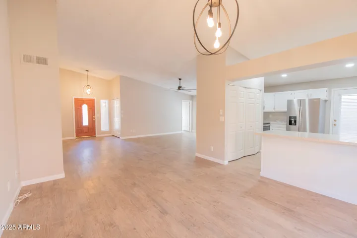 Introducing an exquisite gem in the sought-after neighborhood of Dobson Ranch: a stunningly remodeled 3 bedroom, 3 bathroom home boasting multiple primary suites. This residence offers a luxurious living experience with its thoughtfully designed interiors and remarkable outdoor oasis. Step into the great room and be captivated by the grandeur of vaulted ceilings, complemented by a cozy fireplace that sets the perfect ambiance. Adjacent to the great room is a stylish dining room, seamlessly connected to the kitchen, making it ideal for entertaining guests. The kitchen itself is a masterpiece, featuring beautiful white cabinetry and abundance of storage. Escape to the backyard, where a desert oasis awaits. Discover a spacious covered patio, providing a comfortable retreat for relaxation or outdoor gatherings. Stay cool and refreshed with the dual exterior fans, while embracing the delightful aroma of a built-in BBQ. Delight in the pebble tec pool, offering a refreshing respite on warm summer days. The backyard is adorned with lush fruit trees, enhancing the serene ambiance and adding a touch of nature’s beauty to your private retreat.