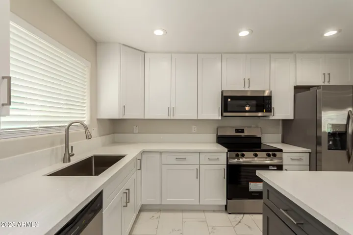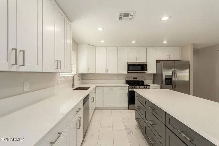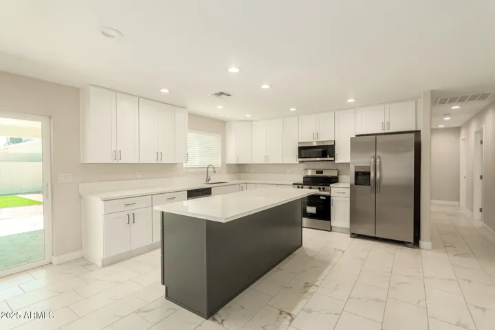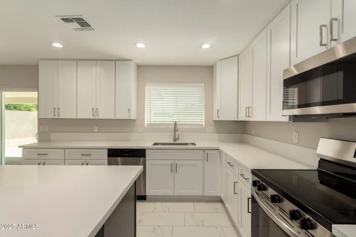 This beautifully remodeled home sits on a spacious corner lot with plenty of parking & an extended paver driveway! Side RV gate entrance with RV pad in the backyard. Inside, you’ll find a spacious open floor plan with new paint, tile flooring, cabinetry & quartz countertops throughout creating a clean and inviting atmosphere. The fully renovated eat-in kitchen is a dream with new stainless steel appliances, farmhouse sink, abundant storage, breakfast bar and island perfect for cooking and entertaining. Sizable laundry room offers extra functionality. The custom-designed bathrooms feature stylish finishes, while major updates including water heater, HVAC and roof add to your peace of mind. Remarks continued….. Step outside to a thoughtfully landscaped backyard with a large covered patio, paver walkways, gravel and turf, ideal for relaxing or hosting gatherings. This home truly combines modern comfort with practical upgrades and is move-in ready!