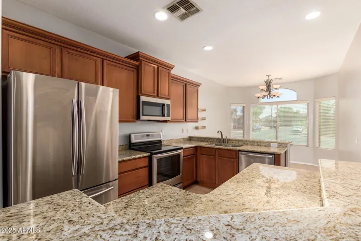 SOLAR, SOLAR, SOLAR!!!!! NEW PRICE IMPROVEMENT! Tenant will be charged $175.00 per month for Solar in addition to the monthly rent. Lovely home in the beautiful Royal Ranch neighborhood. This home is move in ready. Stainless appliances, granite countertops in the kitchen with a breakfast nook. Washer and Dryer included. Bay window in kitchen and master bedroom. Beautiful backyard with synthetic grass for easy care. Two large overhead storage racks in the garage. Close to shopping, restaurants, baseball and Surprise Water Park and activity center. ALL THIS WITH SOLAR!!!