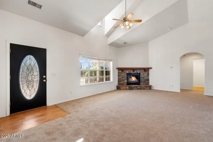 Attractive Bright Star home situated on a 0.23-acre lot, offering incredible views. The residence boasts 1697 sq ft, featuring 3 bedrooms and 2 bathrooms. This well-maintained home features a great room floorplan. New carpet has been installed throughout. The open living area includes a gas fireplace, formal dining space, and a bright kitchen, creating a comfortable living environment. Conveniently located in Chino Valley, the property benefits from paved roads and access to a community park, as well as proximity to shopping centers, medical facilities, restaurants, and schools.