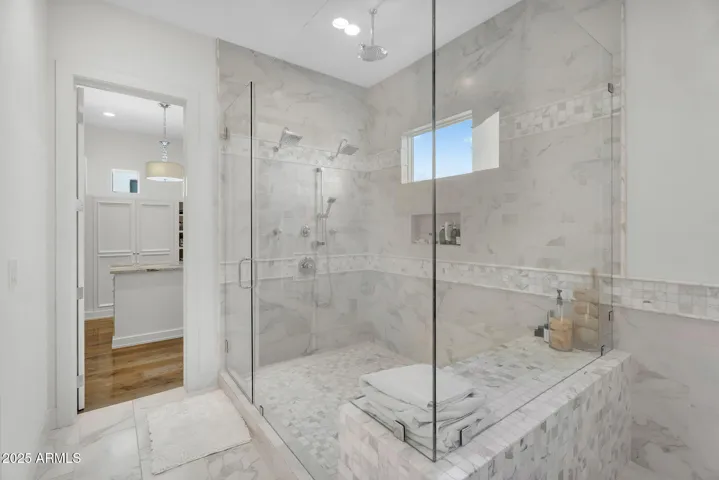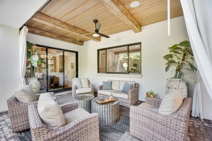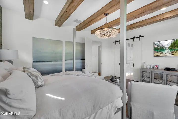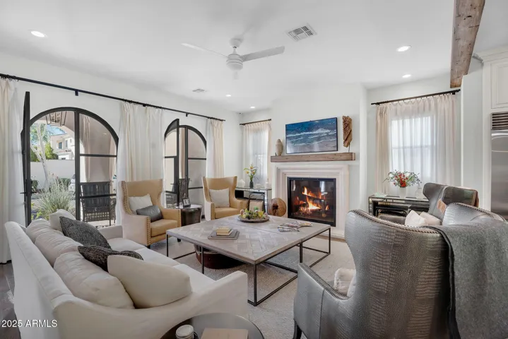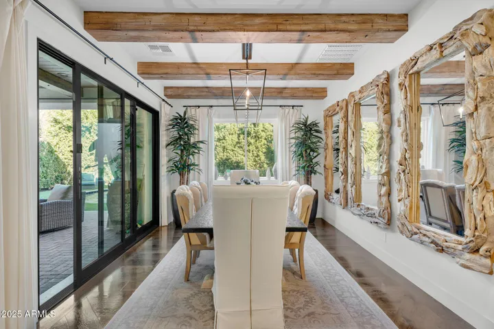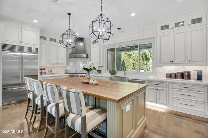 Step through the custom arched iron front door, and you’re immediately greeted by an ambiance of understated grandeur. Rich, real hardwood floors flow throughout the home, complementing the exposed wood beam ceilings and the abundance of natural light that filters through the oversized windows and doors. The chef’s kitchen is the heart of the home, a chefs dream- featuring Sub-Zero and Wolf appliances, butcher block island, marble countertops & backsplash, and Stone Creek Custom Cabinetry. Wine Fridge, huge pantry, under cabinet lighting. This home has all the bells and whistles you could dream up. The adjacent dining area and great room open to both the front and back patios through custom glass doors, creating a seamless indoor-outdoor living experience perfect for entertaining year-round.