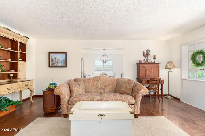 Make yourself at home in this Ralph Haver designed single-level townhome in the Adult Community of Golden Keys! One of the few units that only has 1 common wall and a side gate to enter backyard. Spacious living room, with hardwood flooring. The formal dining room, with plantation shutters and is perfect for hosting all the get togethers! Kitchen is complete with stainless steel appliances, rich wood cabinetry, quartz counters, a tile backsplash. Retreat to the large main suite, featuring a sitting area, and an ensuite. The AZ room is excellent for year-round entertainment! Very well kept backyard with artificial turf, pavers and side yard entry from front yard. Close to Old Town, Scottsdale.Large community pool and Clubhouse just down the street.