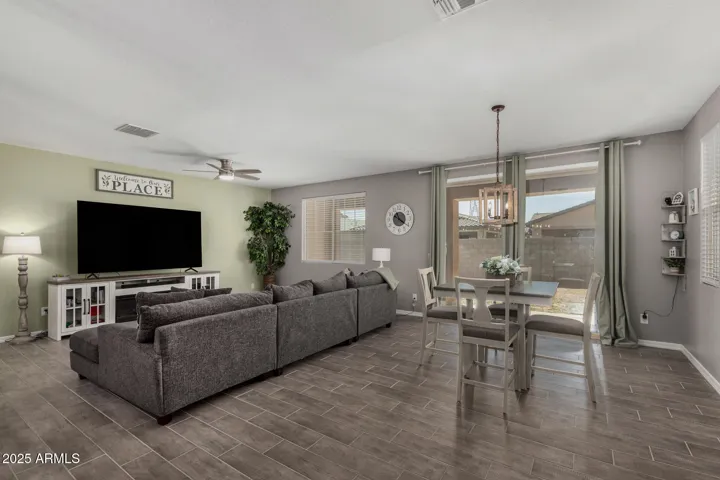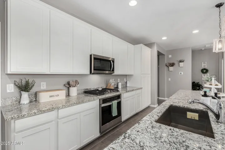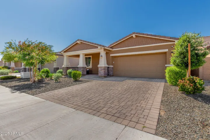 Presenting this beautiful 3-bedroom home featuring a 3-car garage and a welcoming front porch. Designed for both everyday living and entertaining, the open-concept layout centers around a well-appointed kitchen offering recessed & pendant lighting, white cabinets, stainless steel appliances, granite counters, and a prep island with a breakfast bar. Venture to the romantic primary retreat to find plush carpet, an ensuite with two vanities, and a walk-in closet. The secondary bedrooms include their own closets, while the versatile den with double doors can serve as a 4th bedroom, office, or media room. With its covered patio, the spacious backyard is ideal for creating memorable gatherings with loved ones and friends.