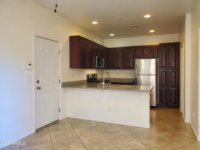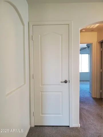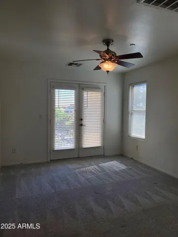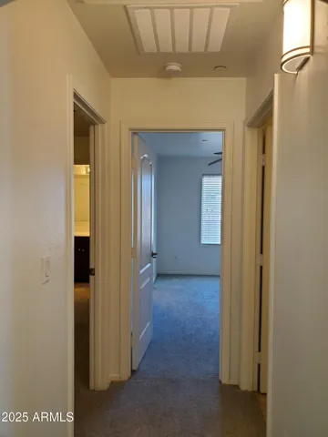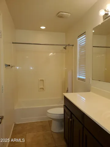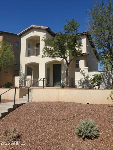 Verrado is GROWING! Be a part of the community by moving into this three bedroom two-and-half bath two-story home situated on an elevated lot to enjoy the surrounding views. The lower level has the living/dining/kitchen areas with the two-car garage at the back of the house. Kitchen is fully equipped with an adjacent dining area and a storage room under the stairwell. Upstairs are where the bedrooms/bathrooms/laundry areas are located. Primary bedroom has a balcony off the french door pass-through with its own full bathroom with private water closet and a walk-in closet. Laundry room is adjacent and across from both guest bedrooms. The guest bathrooms upstairs has direct access from both guest bedrooms. Access to Center of Main fitness & Heritage Swim Park are resident amenities.