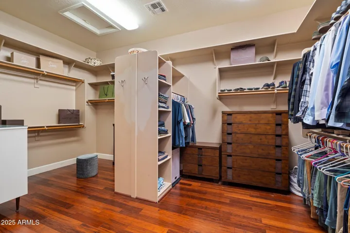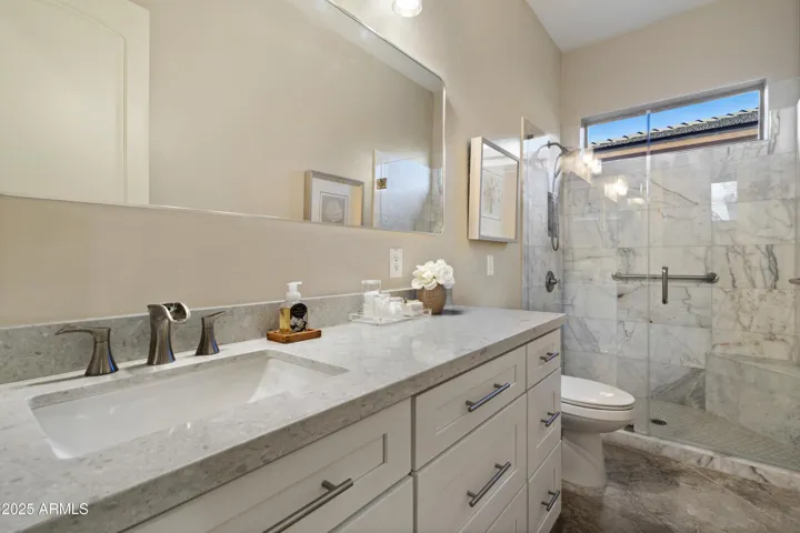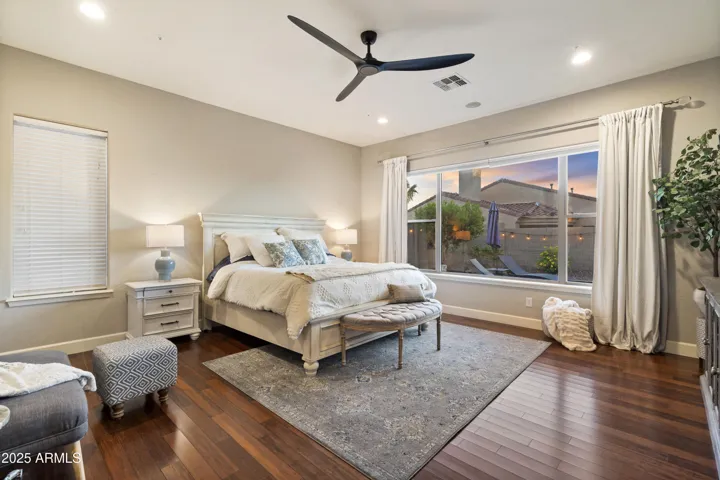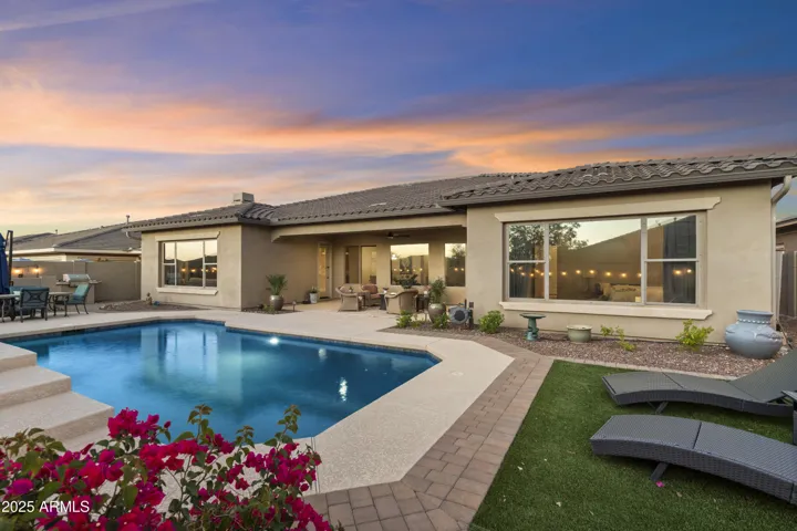 Outdoors, enjoy Arizona living at its best with a sparkling pool and soothing water feature, surrounded by manicured landscaping and peaceful privacy. Additional upgrades include custom rain gutters and solar window film for enhanced comfort and efficiency.