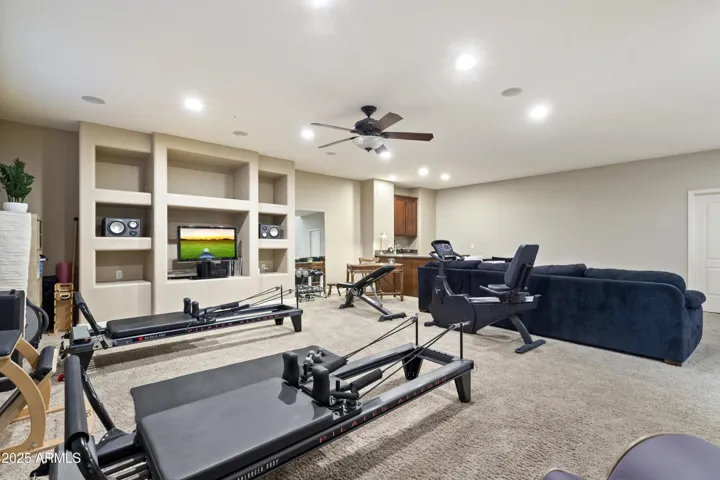 Welcome to this elegant San Vicente model in the gated Fairways at Estrella Mountain Ranch. Estrella offers resort living, all included in a $201 a month HOA! The home boasts 4,929 sq. ft., 5 bedrooms, 3.5 baths, a 3-car garage, and a sparkling pool. A private courtyard with a cozy fireplace sets the tone for this desert retreat. Inside, hardwood and porcelain tile floors accent bright, open spaces perfect for entertaining. The chef’s kitchen boasts premium finishes and generous workspace, while the primary suite offers a spa-like bath with dual vanities and a huge walk-in closet. The finished basement features two bedrooms, and a spacious living area / flex room with wet bar, ideal for a gym, media space or both—perfect for multigenerational living or guests. Abundant storage includes two large storage closets in the basement and a climate-controlled storage room in the garage.