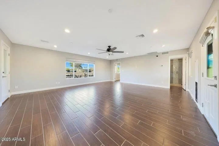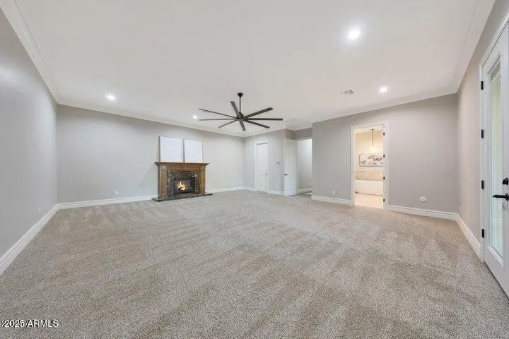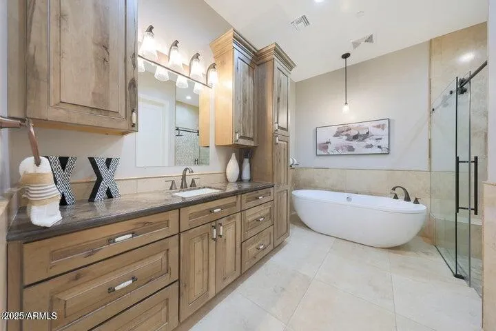 This custom-built estate redefines luxury central Scottsdale living and is ready for you to claim it as your own! Upon arrival, you are welcomed into an expansive great room and chef’s kitchen, where tall ceilings and oversized sound-deadening windows create a serene and inviting ambiance. The warmth of a fireplace, custom-built bookcases, and extensive travertine finishes set the tone for a comfortable lifestyle. Rich knotty maple woodwork adds timeless charm, complementing a striking white island adorned with Rainforest Brown marble, a farmhouse sink, and dark chocolate brown solid travertine countertops. Professional-grade appliances, designer lighting, and sleek eight-blade fans complete the exquisite aesthetic. Each bedroom is a private en-suite retreat, ensuring unparalleled. comfort and convenience. The home also boasts a versatile second kitchen – an attached, fully-equipped casita, catering to diverse lifestyle needs. Nearest the second kitchen is a second living room, along with 2 bedrooms and 2 bathrooms, creating an excellent option for rental income by living in the main home while renting out this 2 bedroom/2 bathroom guest house-style wing. While they are currently connected, they can be easily separated.