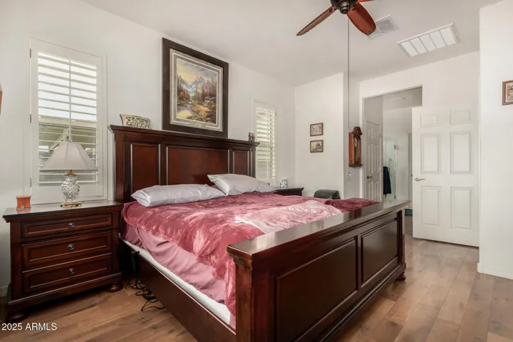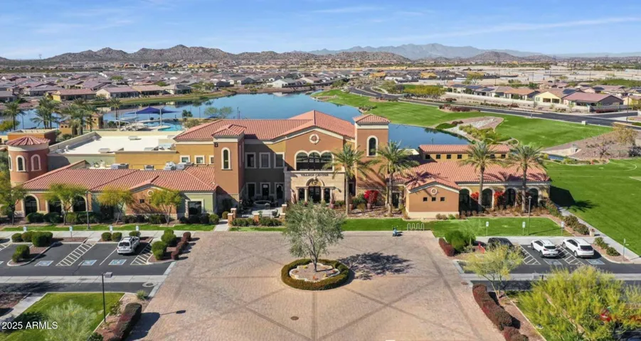 Experience vibrant adult living in CantaMia! This stunning 2-bedroom home welcomes you w/ a 2-car garage, stylish pavers, eye-catching stone accents, & an inviting front patio. Discover a serene great room w/ high ceilings, a soothing palette, classic plantation shutters, and wood flooring. The gourmet kitchen comes w/ granite counters, wood shaker cabinets w/ crown moulding, pendant/recessed lighting, a mosaic tile backsplash, stainless steel appliances, & an island w/ a breakfast bar for casual meals. The primary bedroom showcases a cozy sitting nook, an ensuite w/ dual sinks, & a walk-in closet. Imagine tranquil moments in the lovely backyard, boasting a covered patio, a picturesque desert landscape, breathtaking mountain views, & a fire pit for starlit evenings. Make this yours!