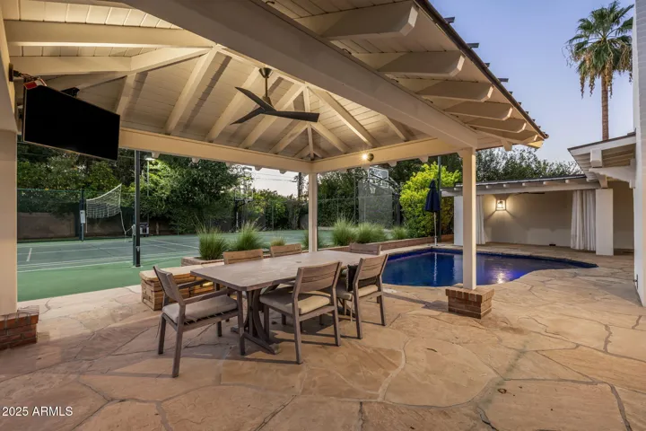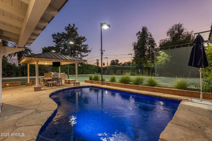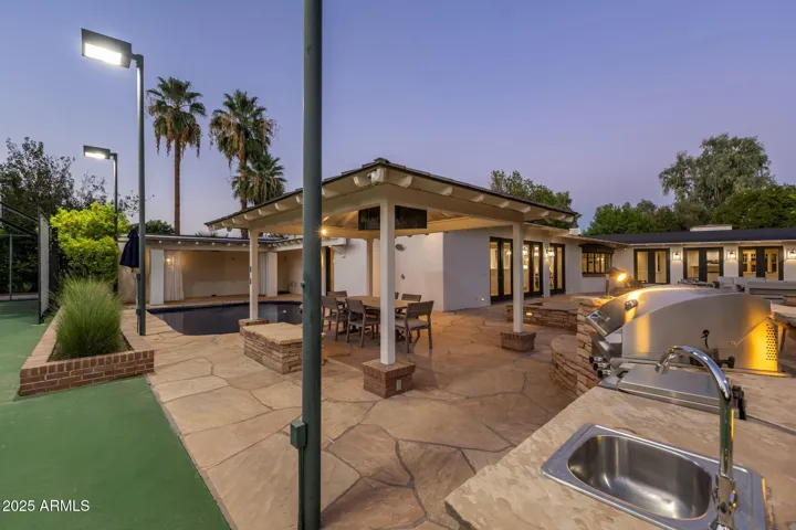 Outdoors, the estate transforms into a private resort. Enjoy the shimmering tile pool, unwind beneath the private cabana, enjoy the covered BBQ lounge, or gather for friendly competition on the fully lit sport courtcomplete with tennis, pickleball, basketball, and even a discreet full-size batting cage.