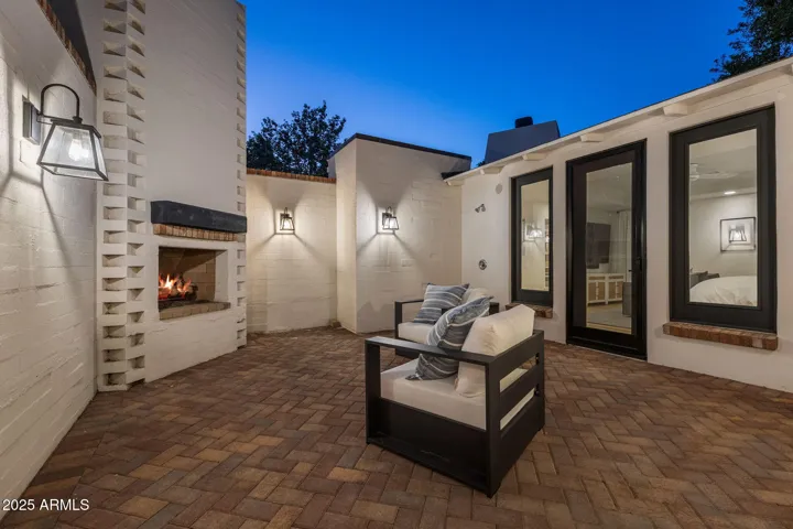 From the moment you arrive, the home’s dreamy front yard with its elegant outdoor fireplace setting welcomes you with warmth and charm—an inviting space to gather with friends beneath the stars or enjoy quiet moments surrounded by lush greenery.